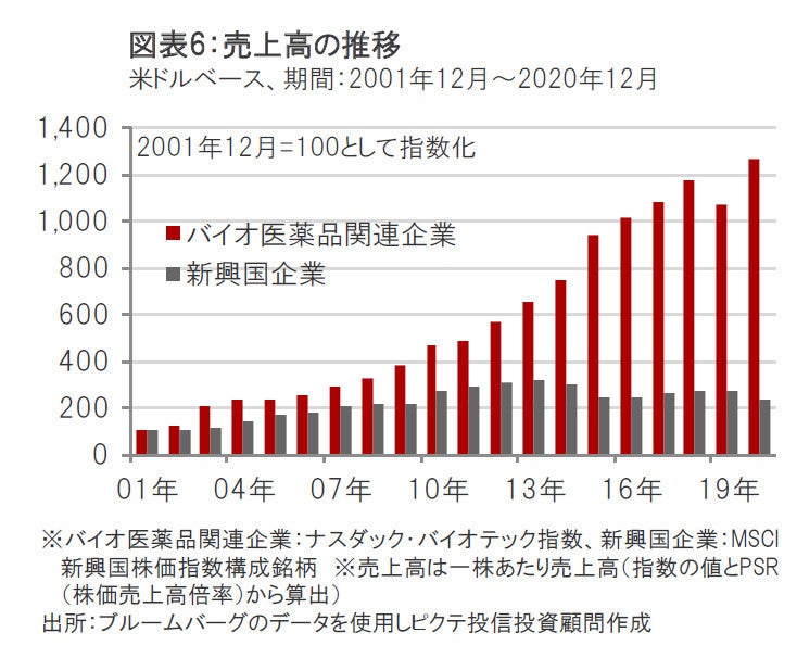 バイオ医薬品関連企業の売上高は、新興国の企業を上回って堅調に成長してきました。(図表6参照)