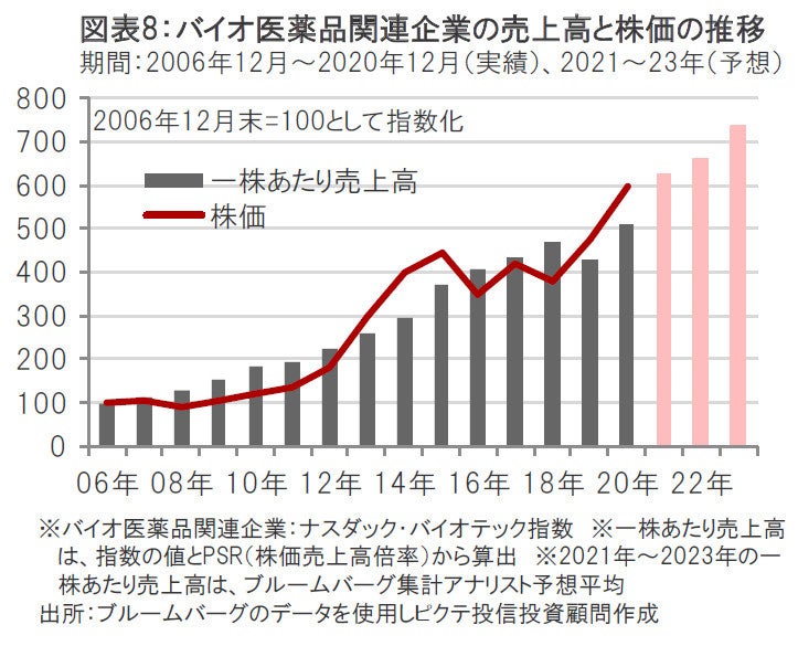 過去の実績では、バイオ医薬品関連企業の株価は、売上高の伸びとともに上昇してきたことがわかります。(図表8参照)