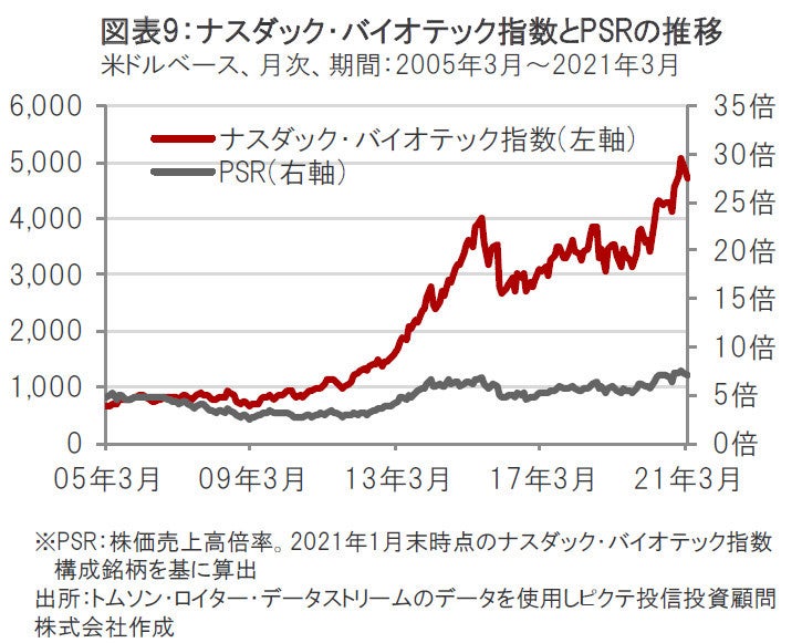足元、新型コロナウイルスの治療薬およびワクチン開発・認可・接種への期待やバイオ医薬品企業の業績が景気動向に左右されにくい特性などが注目されて株価が上昇しており、PSR(株価売上高倍率)で見たバリュエーション(投資価値評価)の水準も上昇しています。(図表9参照)