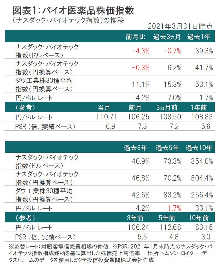 3月のナスダック・バイオテック指数(ドルベース、配当含まず)は下落しました。