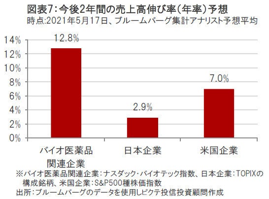 バイオ医薬品関連企業については、①有望な治療薬候補の良好な治験結果の発表、②大型の新薬の承認、③新薬販売開始後の業績寄与の拡大などを背景に、米国企業や日本企業よりも相対的に高い売上高の伸びが見込まれています。(図表7参照)