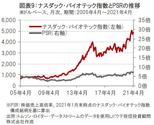 足元、新型コロナウイルスの治療薬およびワクチン開発・認可・接種への期待やバイオ医薬品企業の業績が景気動向に左右されにくい特性などが注目されて株価が上昇しており、PSR(株価売上高倍率)で見たバリュエーション(投資価値評価)の水準も上昇しています。(図表9参照)