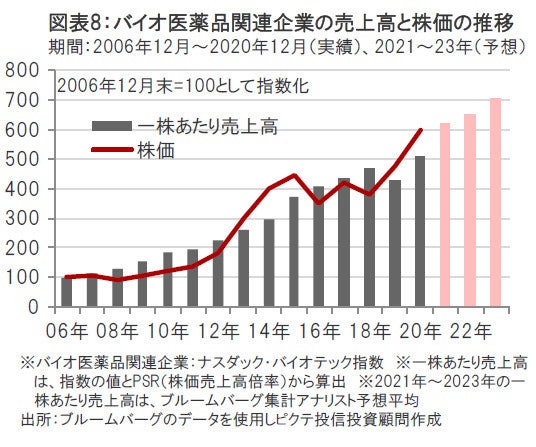 過去の実績では、バイオ医薬品関連企業の株価は、売上高の伸びとともに上昇してきたことがわかります。(図表8参照)