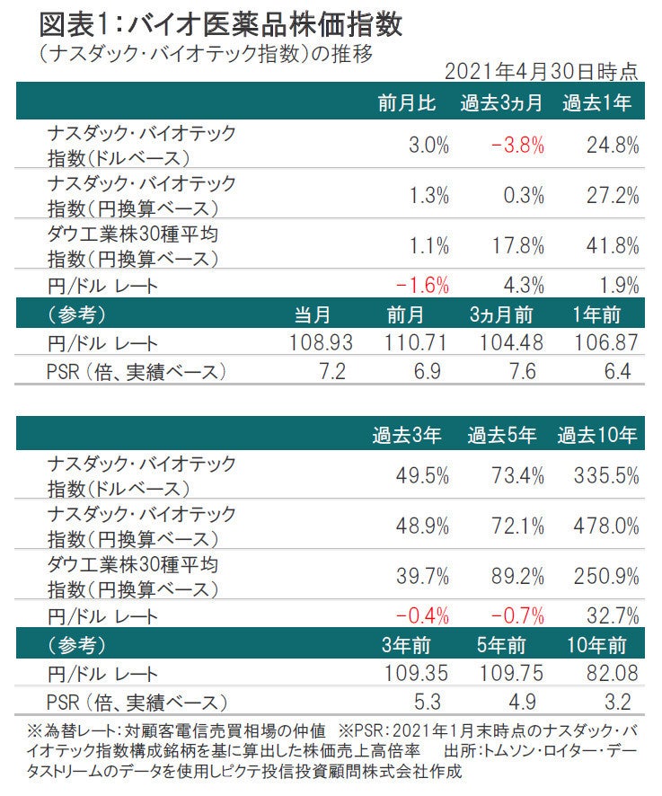 4月のナスダック・バイオテック指数(ドルベース、配当含まず)は上昇しました。