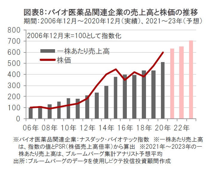 過去の実績では、バイオ医薬品関連企業の株価は、売上高の伸びとともに上昇してきたことがわかります。(図表8参照)