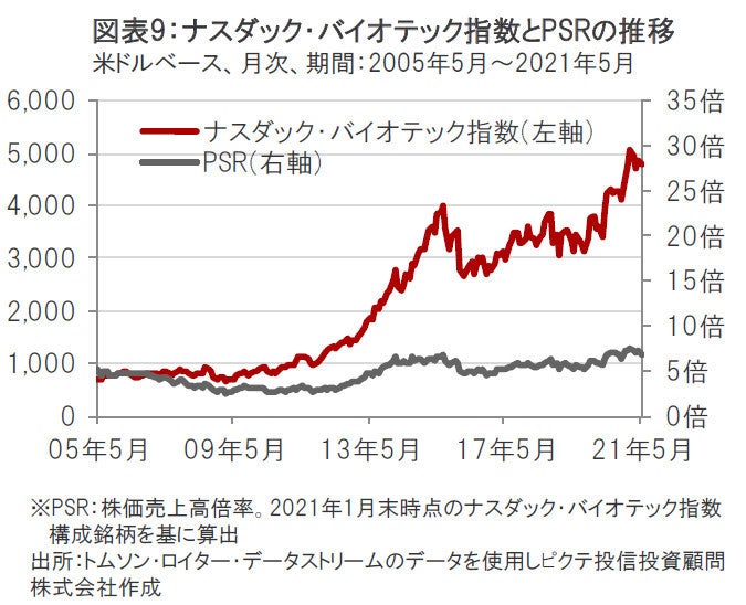 新薬の開発動向が順調に推移していることやバイオ医薬品企業の業績が景気動向に左右されにくい特性などが注目されて株価が上昇しており、PSR(株価売上高倍率)で見たバリュエーション(投資価値評価)の水準も上昇しています。(図表9参照)