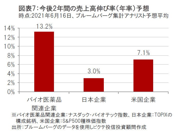 バイオ医薬品関連企業については、①有望な治療薬候補の良好な治験結果の発表、②大型の新薬の承認、③新薬販売開始後の業績寄与の拡大などを背景に、米国企業や日本企業よりも相対的に高い売上高の伸びが見込まれています。(図表7参照)