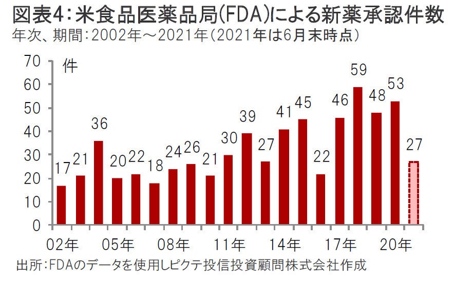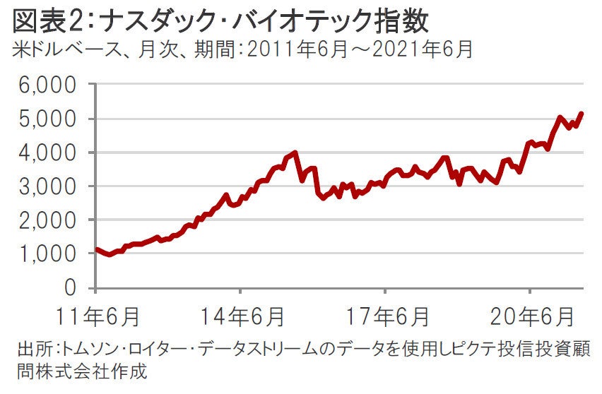 バイオ医薬品セクターについては、短期的には引き続き新型コロナウイルスの感染動向を注視する必要があると考えます。デルタ株のような新しい亜種が優勢となった場合、再び患者数が急増し、さらなる感染対策が求められる可能性があります。他方、アルツハイマー型認知症治療薬アデュヘルム(一般名:アデュカヌマブ)の迅速承認と価格設定は米国連邦議会の監視の対象となる可能性があり、短期的にバイオ医薬品株式市場を大きく変動させる要因となるかもしれません。ただし薬価を巡る動きについては、今後、進められることは間違いありませんが、議会での動きなどを勘案すると急進的なものではなく超党派によるより穏当な内容に落ち着く公算が大きいと考えています。