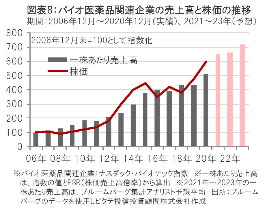過去の実績では、バイオ医薬品関連企業の株価は、売上高の伸びとともに上昇してきたことがわかります。(図表8参照)