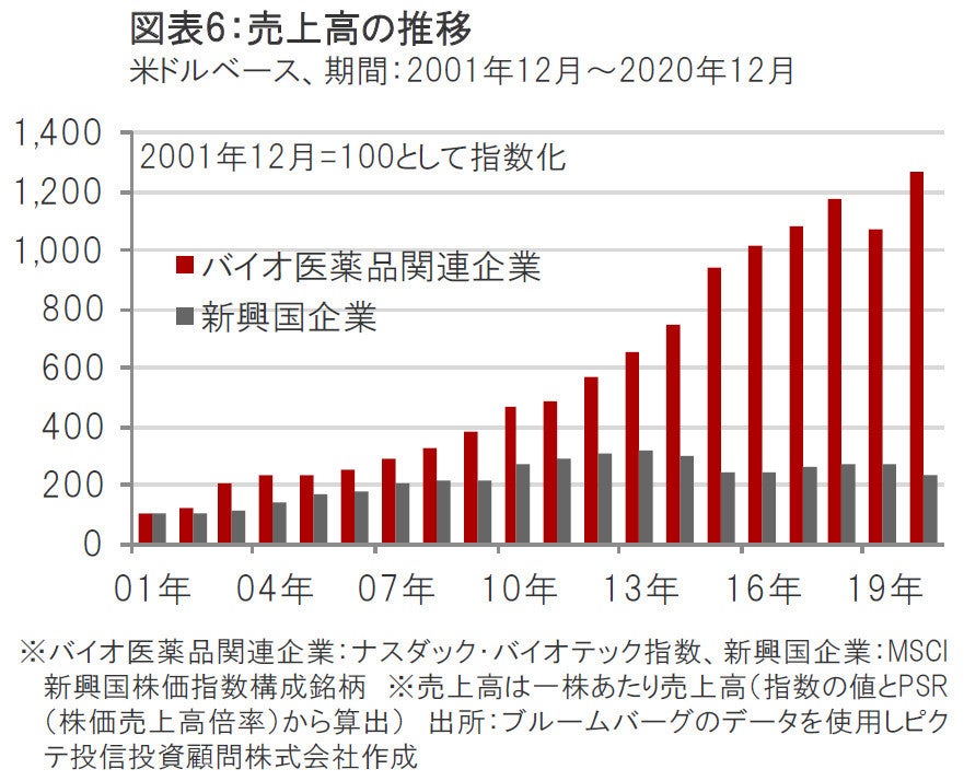バイオ医薬品関連企業の売上高は、新興国の企業を上回って堅調に成長してきました。(図表6参照)