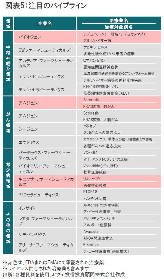 株価が大きく上昇した銘柄としては、バイオジェン(米国)、インテリア・セラピューティクス(米国)、ノババックス(米国)などが挙げられます。バイオジェンは、FDAによるアルツハイマー型認知症治療薬の承認を受けて株価が上昇しました。ノババックスは、新型コロナウイルス・ワクチンの治験で良好な結果が得られたこと、とりわけmRNA型ワクチンと同等以上の有効性を示しつつ、忍容性(接種者が副反応に耐えられる程度)がmRNA型ワクチンよりも優れていたことが好感されました。インテリア・セラピューティクスは、ATTRアミロイド症患者のゲノム編集治療の治験が良好な結果を示し、新分野の治療を進めるとの期待が強まりました。