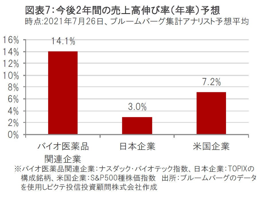 バイオ医薬品関連企業については、①有望な治療薬候補の良好な治験結果の発表、②大型の新薬の承認、③新薬販売開始後の業績寄与の拡大などを背景に、米国企業や日本企業よりも相対的に高い売上高の伸びが見込まれています。(図表7参照)