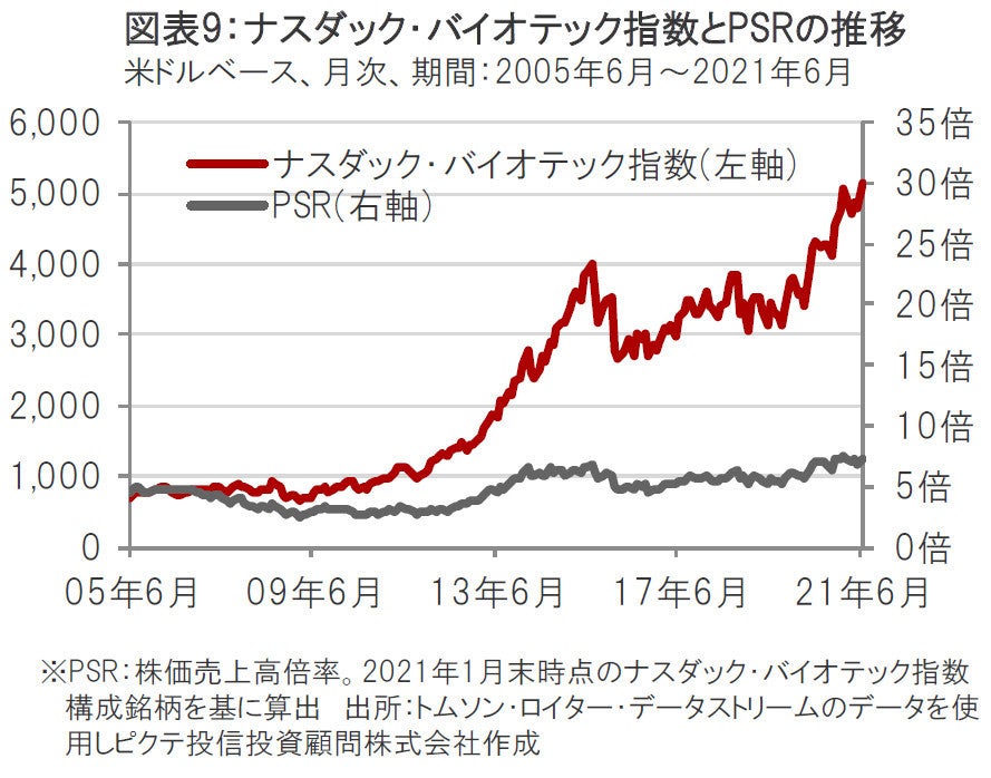 新薬の開発動向が順調に推移していることやバイオ医薬品企業の業績が景気動向に左右されにくい特性などが注目されて株価が上昇しており、PSR(株価売上高倍率)で見たバリュエーション(投資価値評価)の水準も上昇しています。(図表9参照)