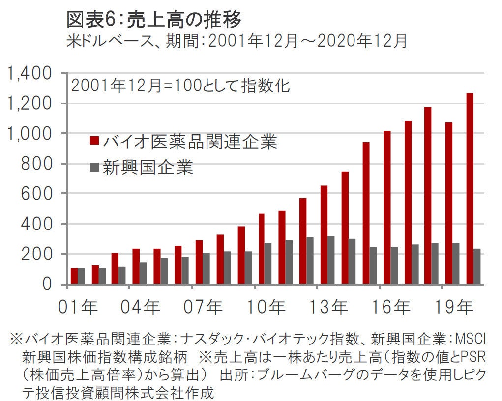 バイオ医薬品関連企業の売上高は、新興国の企業を上回って堅調に成長してきました。(図表6参照)