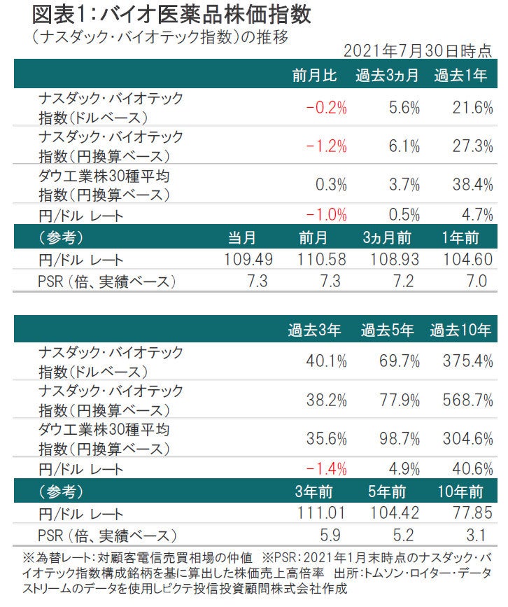 7月のナスダック・バイオテック指数(ドルベース、配当含まず)は小幅に下落しました。