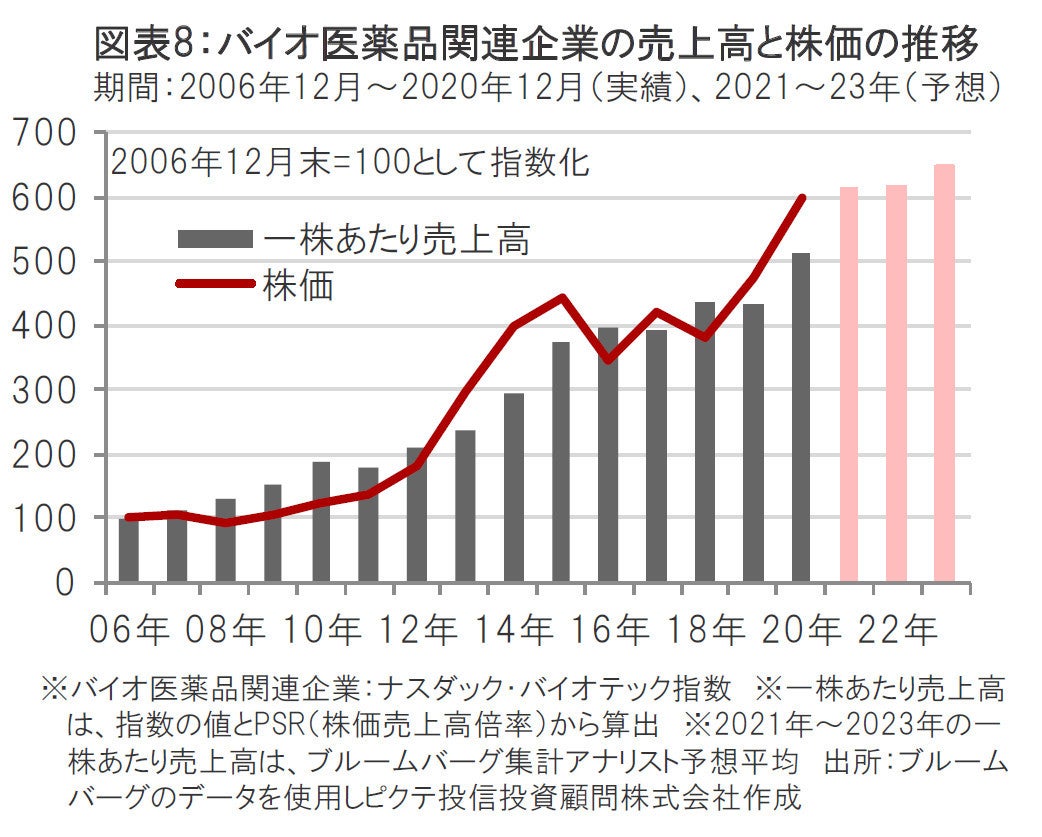 過去の実績では、バイオ医薬品関連企業の株価は、売上高の伸びとともに上昇してきたことがわかります。(図表8参照)