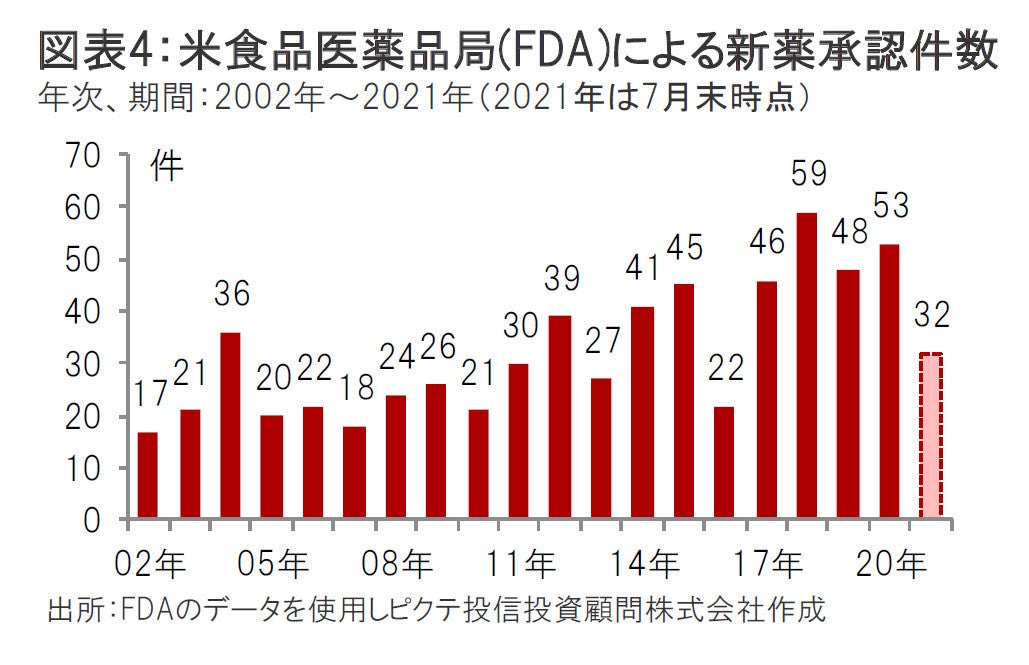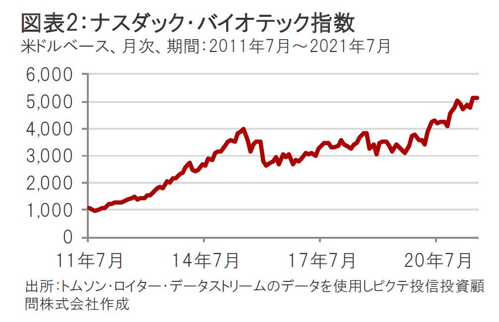 バイオ医薬品セクターについては、短期的には引き続き新型コロナウイルスの感染動向を注視する必要があると考えます。デルタ株のような新しい亜種が優勢となった場合、再び患者数が急増し、さらなる感染対策が求められる可能性があります。他方、アルツハイマー型認知症治療薬アデュヘルム(一般名:アデュカヌマブ)の迅速承認と価格設定は米国連邦議会の監視の対象となる可能性があり、短期的にバイオ医薬品株式市場を大きく変動させる要因となるかもしれません。ただし薬価を巡る動きについては、今後、進められることは間違いありませんが、議会での動きなどを勘案すると急進的なものではなく超党派によるより穏当な内容に落ち着く公算が大きいと考えています。