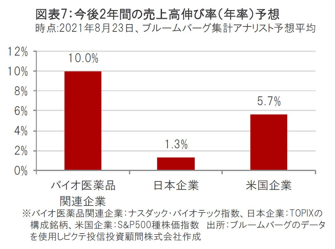 バイオ医薬品関連企業については、①有望な治療薬候補の良好な治験結果の発表、②大型の新薬の承認、③新薬販売開始後の業績寄与の拡大などを背景に、米国企業や日本企業よりも相対的に高い売上高の伸びが見込まれています。(図表7参照)