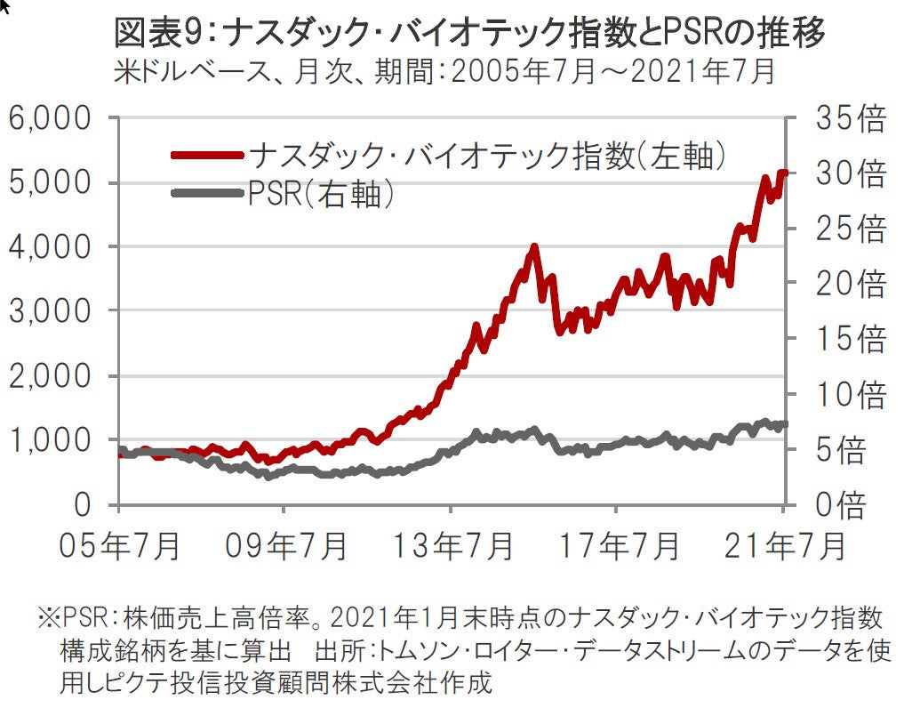 新薬の開発動向が順調に推移していることやバイオ医薬品企業の業績が景気動向に左右されにくい特性などが注目されて株価が上昇しており、PSR(株価売上高倍率)で見たバリュエーション(投資価値評価)の水準も上昇しています。(図表9参照)