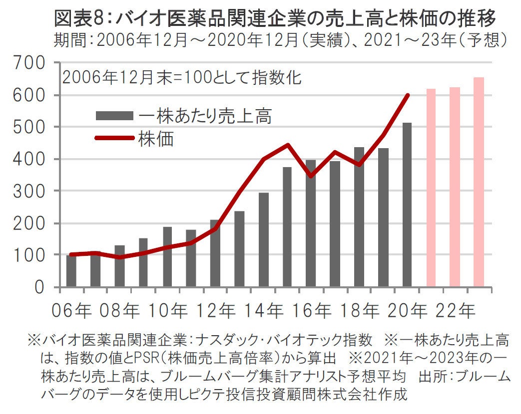 過去の実績では、バイオ医薬品関連企業の株価は、売上高の伸びとともに上昇してきたことがわかります。(図表8参照)