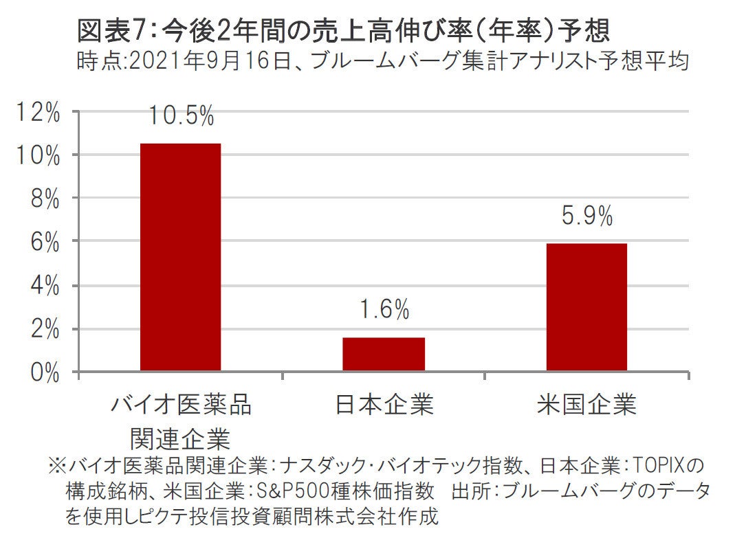 バイオ医薬品関連企業については、①有望な治療薬候補の良好な治験結果の発表、②大型の新薬の承認、③新薬販売開始後の業績寄与の拡大などを背景に、米国企業や日本企業よりも相対的に高い売上高の伸びが見込まれています。(図表7参照)