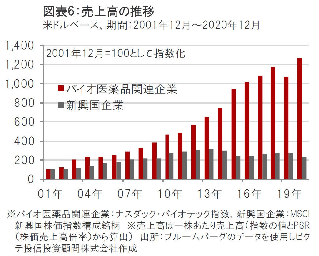 バイオ医薬品関連企業の売上高は、新興国の企業を上回って堅調に成長してきました。(図表6参照)