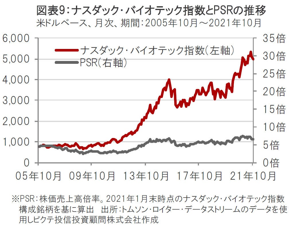 新薬の開発動向が順調に推移していることやバイオ医薬品企業の業績が景気動向に左右されにくい特性などが注目されて株価が上昇しており、PSR(株価売上高倍率)で見たバリュエーション(投資価値評価)の水準も上昇しています。(図表9参照)