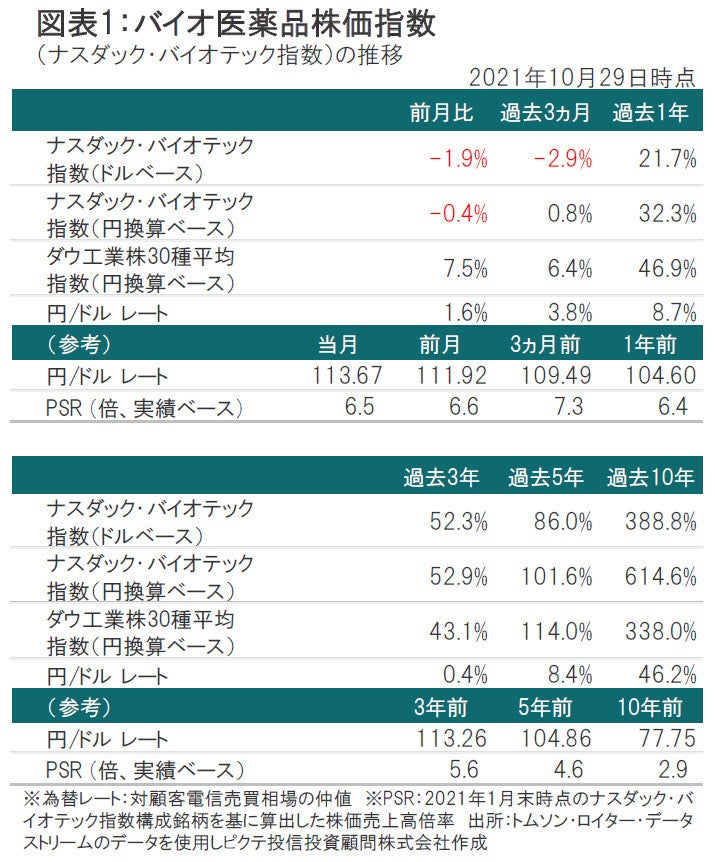 2021年10月のバイオ医薬品市場は、株式市場全体に比べ出遅れる展開となりました。ワクチン製造関連銘柄がその他のバイオ医薬品銘柄と比べて突出して買われる状況は収束していますが、これは、長期的な収益拡大の見通しに欠ける状況がバリュエーション(投資価値評価)を下押し始めたためだと考えます。M&A(合併・買収)は、9月末のメルク(米国)によるアクセレロン・ファーマ(米国)の買収以降、低調な状況が続いていましたが、ブリストル・マイヤーズ・スクイブ(米国)によるオーリニア・ファーマシューティカルズ(カナダ)の買収観測が強まりました。一方で新規株式公開(IPO)については低調でした。また米国議会では、薬価引き下げを巡る議論が続いていますが、実現は難しいことを示唆する状況が相次いでいるように思われます。こうした状況下、小型のバイオ医薬品銘柄は、1年程続いた下落局面から反転底打ちしたように思われます。