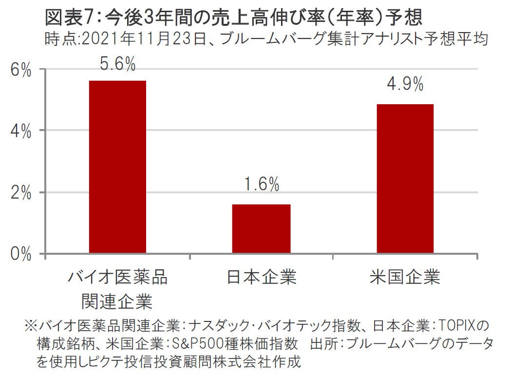 バイオ医薬品関連企業については、①有望な治療薬候補の良好な治験結果の発表、②大型の新薬の承認、③新薬販売開始後の業績寄与の拡大などを背景に、米国企業や日本企業よりも相対的に高い売上高の伸びが見込まれています。(図表7参照)