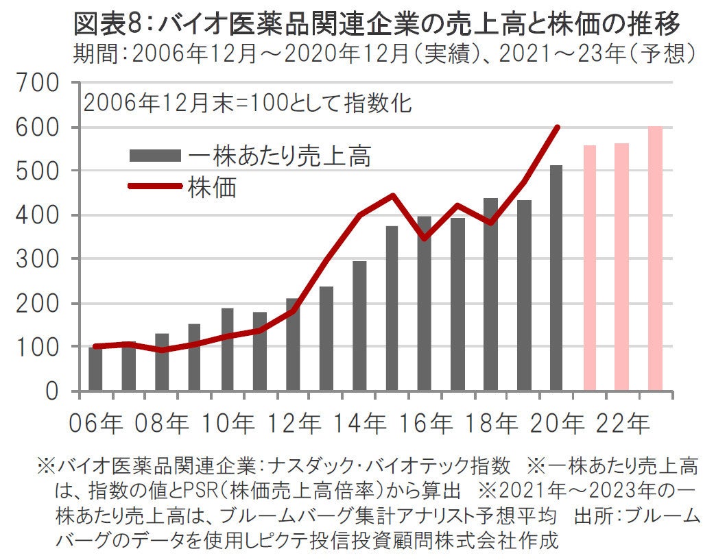 過去の実績では、バイオ医薬品関連企業の株価は、売上高の伸びとともに上昇してきたことがわかります。(図表8参照)