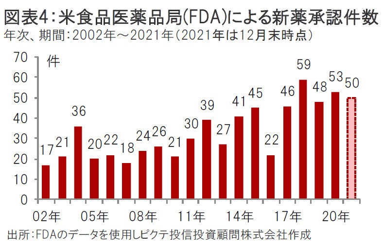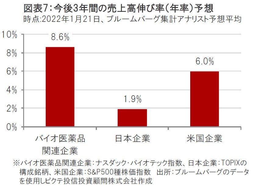 バイオ医薬品関連企業については、①有望な治療薬候補の良好な治験結果の発表、②大型の新薬の承認、③新薬販売開始後の業績寄与の拡大などを背景に、米国企業や日本企業よりも相対的に高い売上高の伸びが見込まれています。(図表7参照)