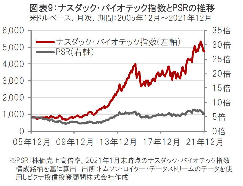新薬の開発動向が順調に推移していることやバイオ医薬品企業の業績が景気動向に左右されにくい特性などが注目されて株価が上昇しており、PSR(株価売上高倍率)で見たバリュエーション(投資価値評価)の水準も上昇しています。(図表9参照)