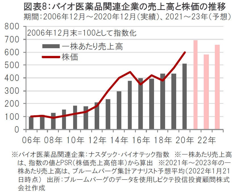 過去の実績では、バイオ医薬品関連企業の株価は、売上高の伸びとともに上昇してきたことがわかります。(図表8参照)