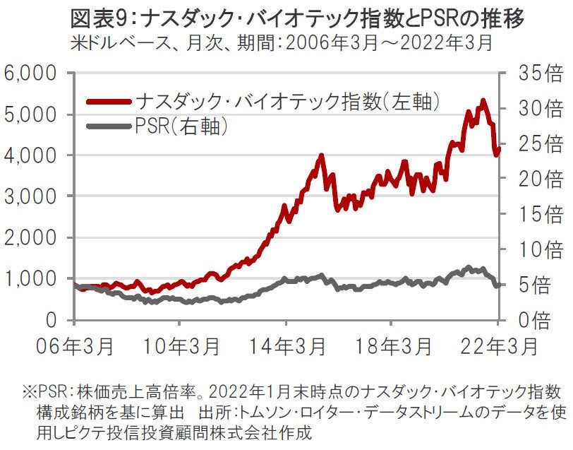 新薬の開発動向が順調に推移していることやバイオ医薬品企業の業績が景気動向に左右されにくい特性などが注目されて株価が上昇しており、PSR(株価売上高倍率)で見たバリュエーション(投資価値評価)の水準も上昇しています。(図表9参照)