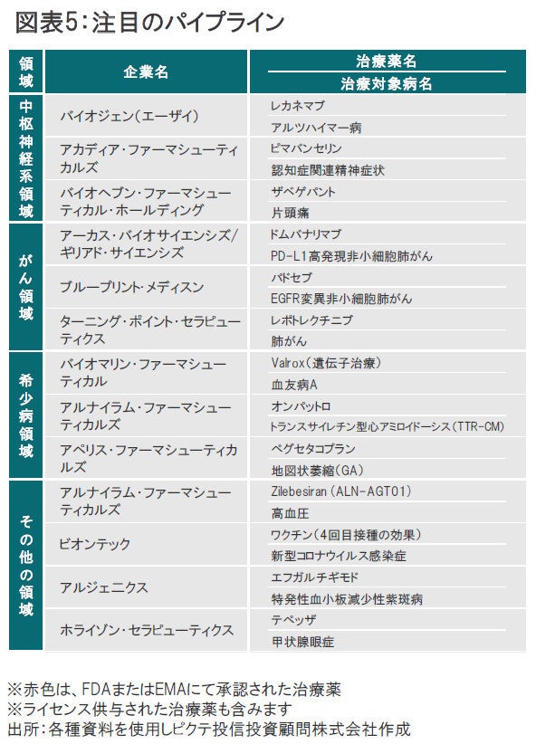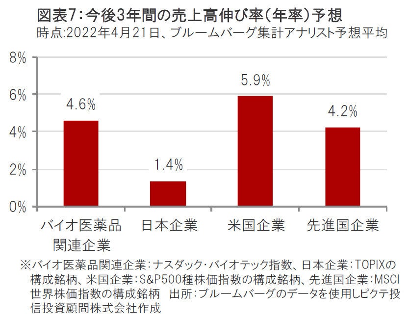バイオ医薬品関連企業については、①有望な治療薬候補の良好な治験結果の発表、②大型の新薬の承認、③新薬販売開始後の業績寄与の拡大などを背景に、今後3年間の売上高の伸び率は年率で+4.6%と、先進国企業よりも高い伸びが見込まれています。(図表7参照)