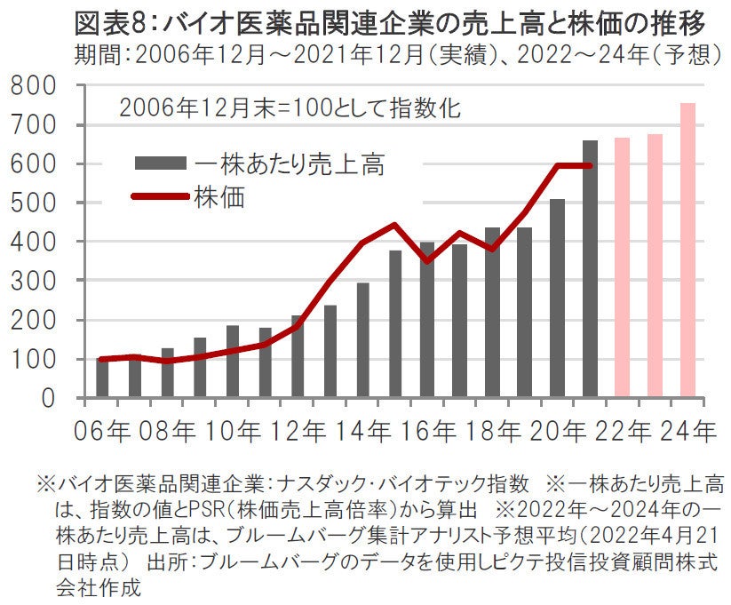 過去の実績では、バイオ医薬品関連企業の株価は、売上高の伸びとともに上昇してきたことがわかります。(図表8参照)