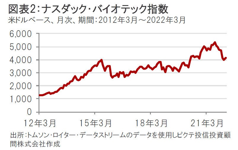 バイオ医薬品セクターについては、2022年には米食品医薬品局(FDA)への信頼が高まり、状況が好転するものと考えます。また大手医薬品企業や大手バイオ医薬品企業は多額の現金を有しており、魅力的な技術や治療薬候補などを持つバイオ医薬品企業とのM&Aや業務提携などの動きが注目されます。他方、バイオ医薬品株式市場は、このところ米国株式市場を下回るパフォーマンスとなっていますが、バリュエーション(投資価値評価)が再び魅力的な水準となり、センチメント(市場心理)も弱気であることから、長期的な価値を見出す機会となっている可能性があると考えます。また米食品医薬品局(FDA)の新長官就任により、FDAに対する信頼度の向上も期待されます。ただし現在、ウクライナ情勢の動向や米国などの金融引き締めの動きなどはバイオ医薬品株式も影響を受ける可能性がある点には注意が必要です。