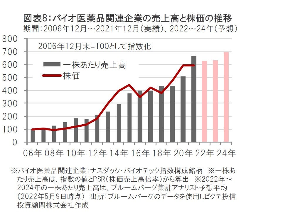 過去の実績では、バイオ医薬品関連企業の株価は、売上高の伸びとともに上昇してきたことがわかります。(図表8参照)
