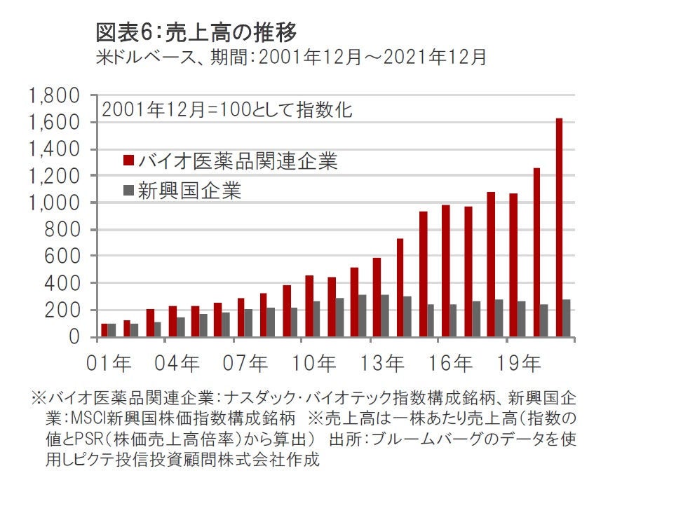 バイオ医薬品関連企業の売上高は、新興国の企業を上回って堅調に成長してきました。(図表6参照)
