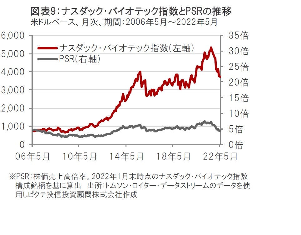 バイオ医薬品企業の業績が景気動向に左右されにくい特性などが注目されて2021年夏頃までは株価が上昇し、PSR(株価売上高倍率)で見たバリュエーション(投資価値評価)の水準も上昇していました。しかし2021年秋以降はFDAの承認申請に対する予想外の決定などがマイナス要因となったことに加え、今年に入りナスダック市場の下落が大きくなる中、ナスダック・バイオテック指数も下落したことから、PSRも低下しています。(図表9参照)