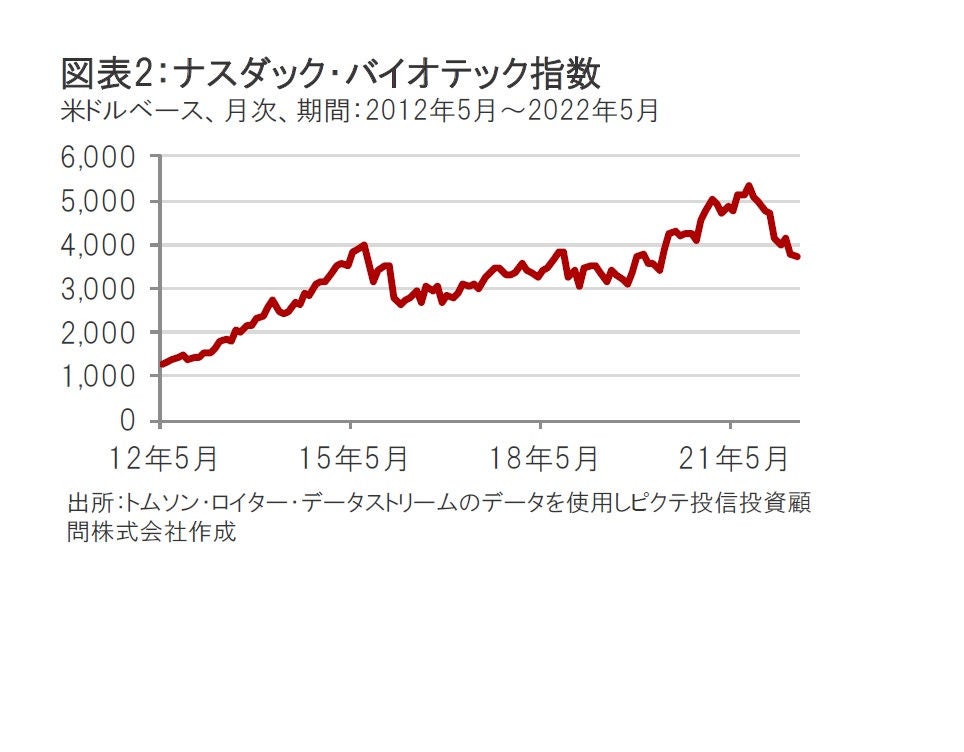 バイオ医薬品セクターについては、2022年は新しいリーダーの下で米食品医薬品局(FDA)への信頼が高まり、状況が好転するものと考えます。また大手医薬品企業や大手バイオ医薬品企業は多額の現金を有しており、魅力的な技術や治療薬候補などを持つバイオ医薬品企業とのM&Aや業務提携などの動きが注目されます。他方、バイオ医薬品株式市場は、このところ米国株式市場を下回るパフォーマンスとなっていますが、バリュエーション(投資価値評価)が再び魅力的な水準となり、センチメント(市場心理)も弱気であることから、長期的な価値を見出す機会となっている可能性があると考えます。ただし現在は、ウクライナ情勢の動向や米国の金融引き締めの動きなどがバイオ医薬品株式にも影響を与える可能性があり、注意が必要と考えます。