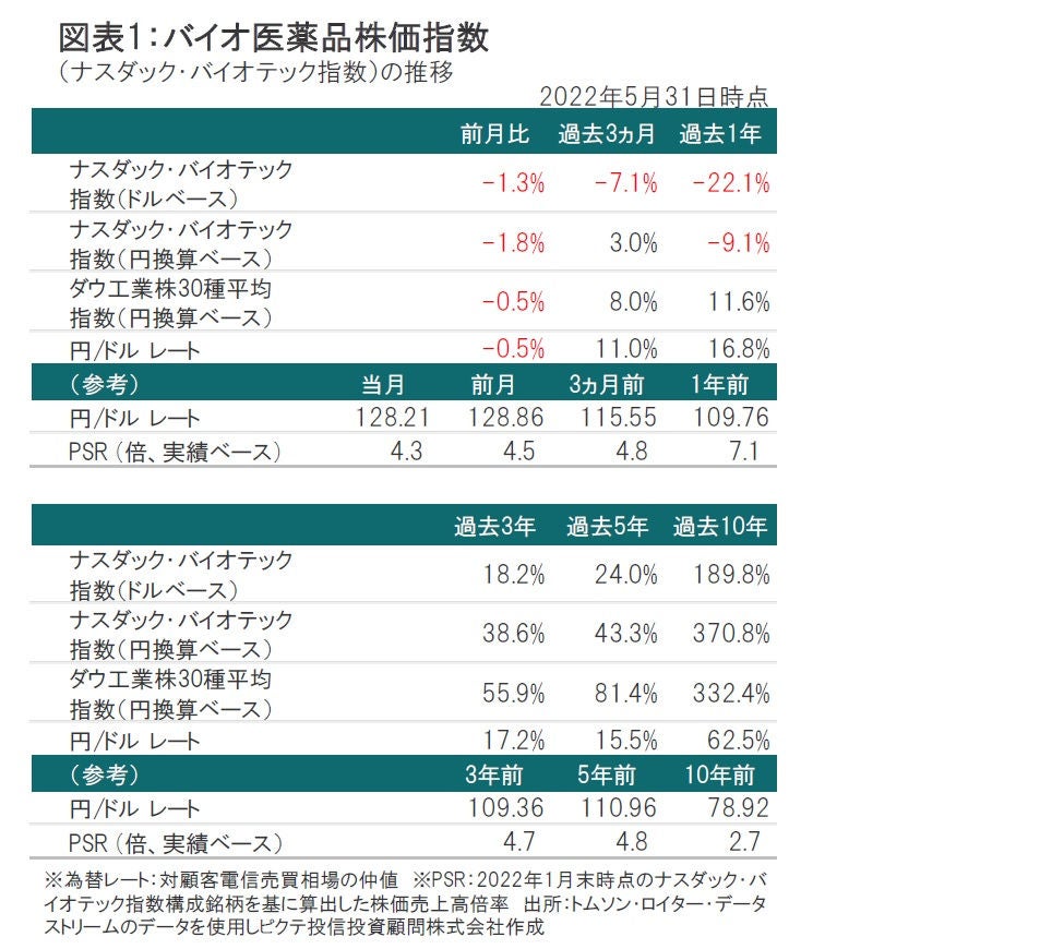 5月のナスダック・バイオテック指数(ドルベース、配当含まず)は下落しました。