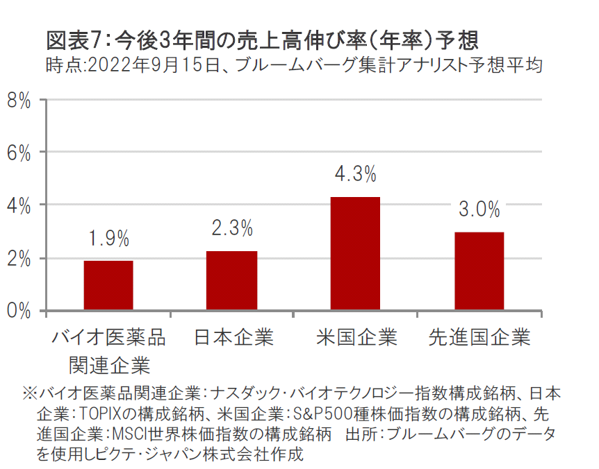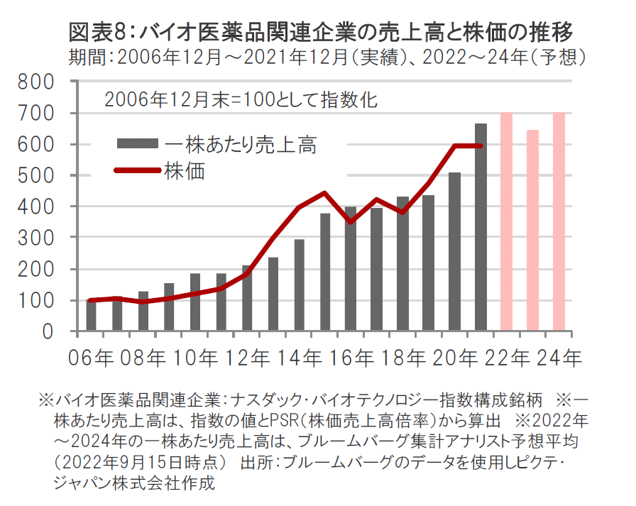 過去の実績では、バイオ医薬品関連企業の株価は、売上高の伸びとともに上昇してきたことがわかります。(図表8参照)
