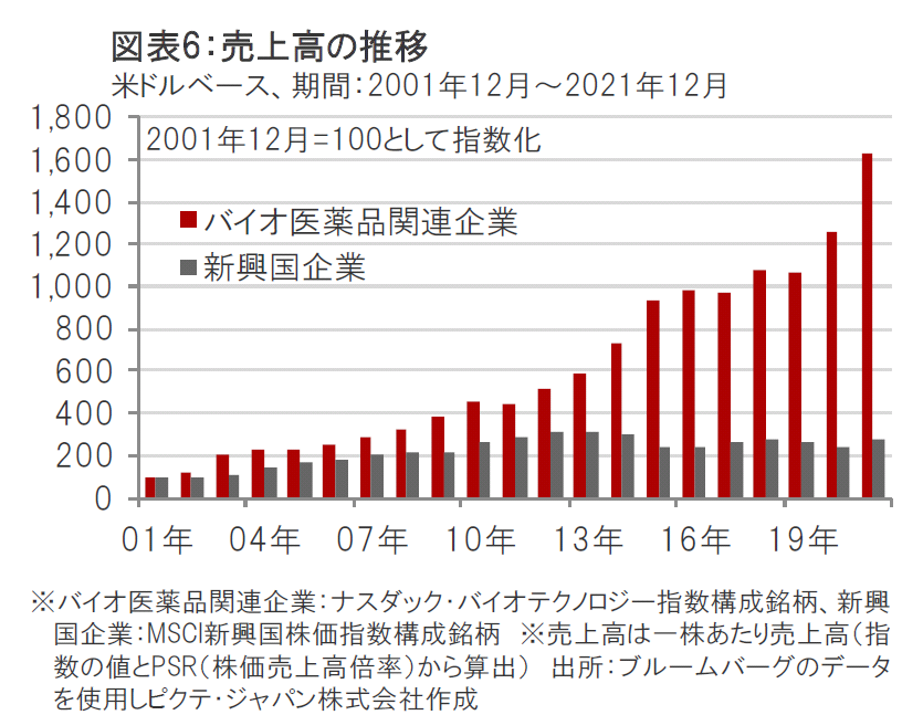 バイオ医薬品関連企業の売上高は、新興国の企業を上回って堅調に成長してきました。(図表6参照)