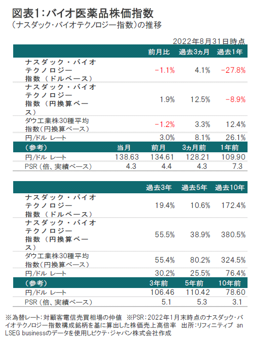 8月のナスダック・バイオテクノロジー指数(ドルベース、配当含まず)は下落しました。