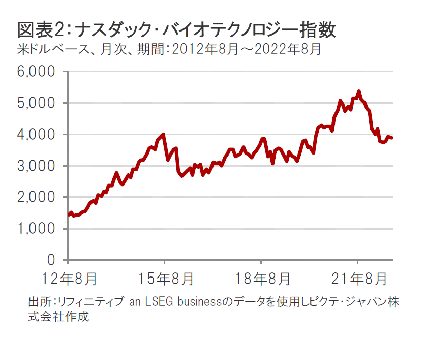 バイオ医薬品企業の業績が景気動向に左右されにくい特性などが注目されて2021年夏頃までは株価が上昇し、PSR(株価売上高倍率)で見たバリュエーション(投資価値評価)の水準も上昇していました。しかし2021年秋以降はFDAの承認申請に対する予想外の決定などがマイナス要因となったことに加え、今年に入りナスダック市場の下落が大きくなる中、ナスダック・バイオテクノロジー指数も下落したことから、PSRも低下しています。(図表9参照)
