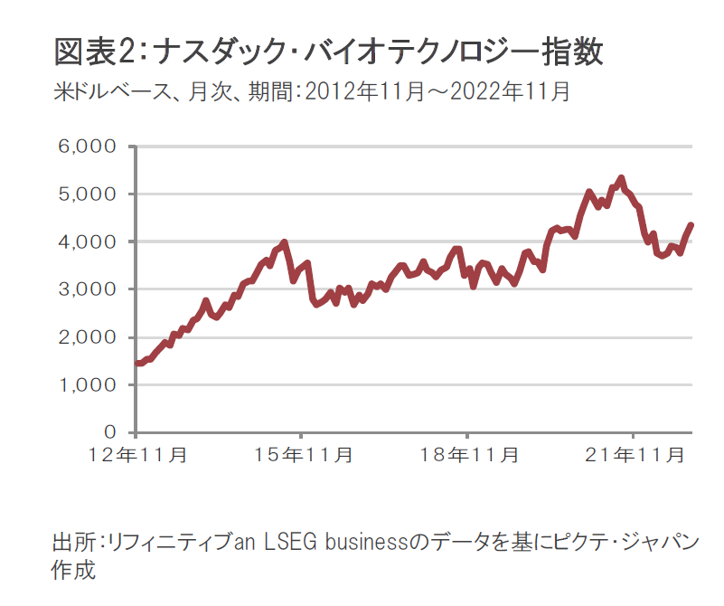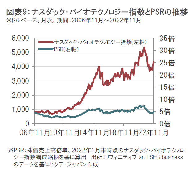 バイオ医薬品企業の業績が景気動向に左右されにくい特性などが注目されて2021年夏頃までは株価が上昇し、PSR(株価売上高倍率)で見たバリュエーション(投資価値評価)の水準も上昇していましたが、2021年秋以降はFDAの承認申請に対する予想外の決定などがマイナス要因となったことに加え、2022年半ばにかけてナスダック市場の下落が大きくなる中、ナスダック・バイオテクノロジー指数も下落したことから、PSR も低下しました。( 図表9 参照)足元は、良好な治験結果の発表や、再びバイオ医薬品企業の業績が景気動向に左右されにくい特性などが注目され、PSRは上昇に転じつつあります。