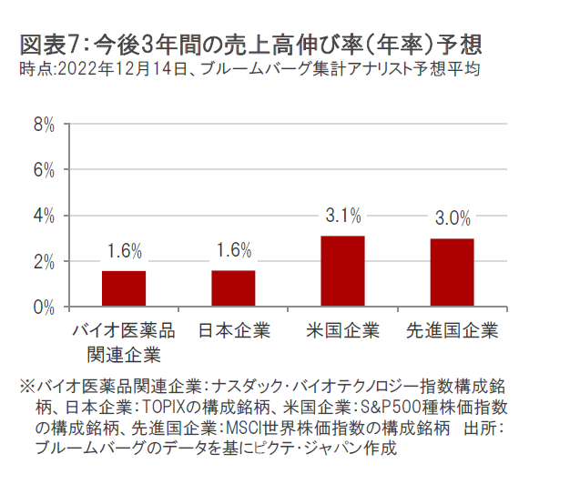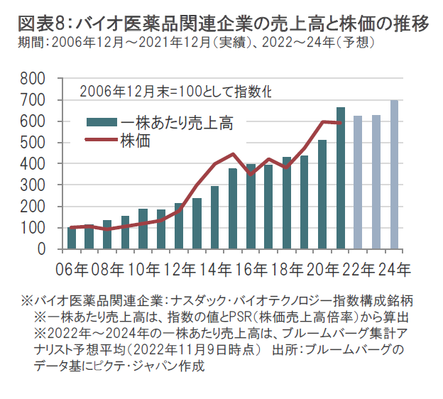 過去の実績では、バイオ医薬品関連企業の株価は、売上高の伸びとともに上昇してきたことがわかります。(図表8参照)
