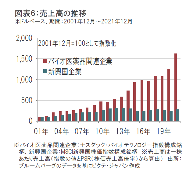 バイオ医薬品関連企業の売上高は、新興国の企業を上回って堅調に成長してきました。(図表6参照)