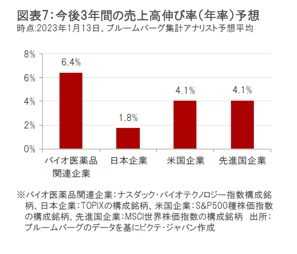 バイオ医薬品関連企業については、引き続き多くの有望な治療薬候補を有しており、新薬承認後の業績寄与が期待されていることから、今後3年間で年率+6.4%の相対的に高い売上高の伸びが期待されています。(図表7参照)